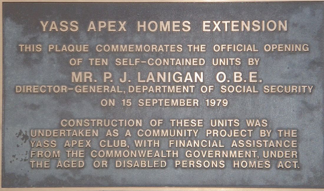 A bequest of $9,750 from the late Mary Callaghan who passed away in 1964 to build accommodation for aged pensioners in Yass. In her will, Miss Callaghan directed her executor (Norman Napper) to build the accommodation and vested the management thereof in the Yass Municipal Council. At that time, local Councils were not bodies eligible for the receipt of subsidy under the Commonwealth Aged Persons Homes Act, It was then that it was offered to Yass Apex Club that they might adopt the proposal as a service scheme. The task was enthusiastically adopted by the Apex Club.