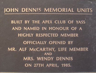 Further, the very generous people of Yass have over the years donated their entire estates or large sums of money to the Yass Apex Homes. Legacy was also a big financial supporter of the project, without which it would not be where it is today. Many other community groups have also helped over the years with money and labour support, one being the Rotary Club of Yass who built a bridge over Chinaman's Creek connecting Yass Apex Homes to Banjo Paterson Park, giving a much shorter and direct route to the main street and its shops. Yass Apex Homes were the first in Yass to provide accommodation for the aged members in our community.